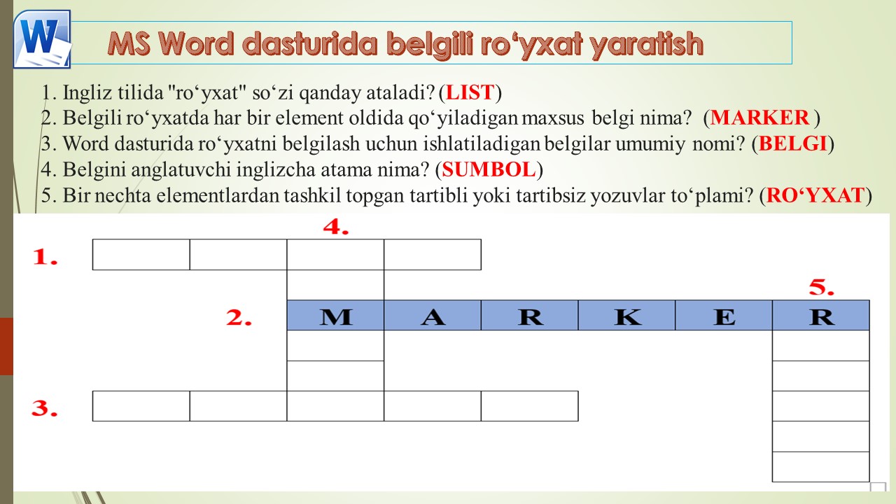 5- mavzu: Belgili ro‘yxat yaratish